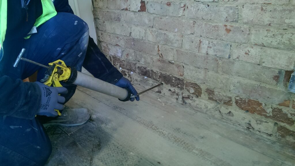 Plaster must be removed during the damp proofing process as rising damp coming from the ground not only brings moisture but also brings hygroscopic salts, nitrates, and chlorides.